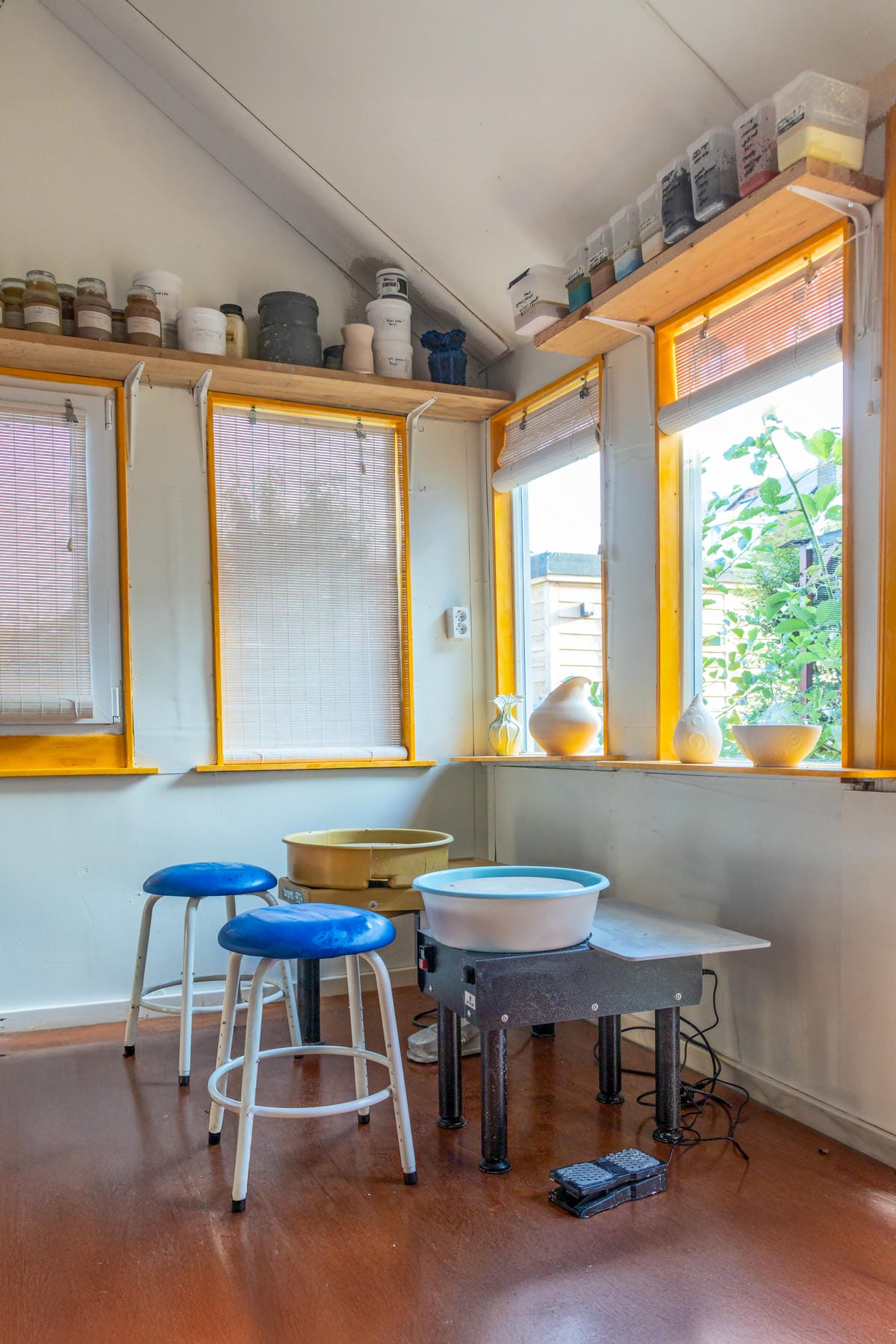 Together with my best friend Julie, we transformed it from a regular workspace into a colorful space that's a joy to behold. This undoubtedly contributes to the greater enjoyment of working and creating there. The space has been emptied, redecorated, and filled with new energy. Not just from me, but also from the people who learn here, laugh, and sometimes even swear a little when their pots collapse.