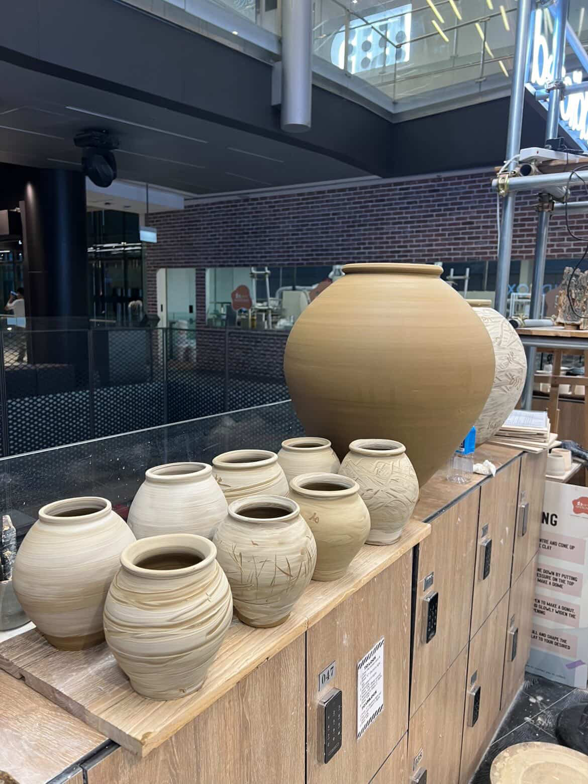 Participants learn how large jars are traditionally thrown in two sections — a top and a bottom — and then joined together to create the final form. This technique allows potters to create vessels much larger than they would normally be able to throw in a single piece.